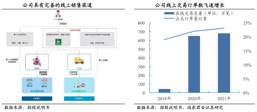 經(jīng)典案例:根據(jù)招股說明書、國泰君安證券研究等綜合資訊表明,百果園實(shí)行“店倉一體化”戰(zhàn)略,不斷增加客戶粘性。水果是在陳列和面銷環(huán)節(jié)附加值最高的大生鮮品類之一,通過店內(nèi)展示、面銷及試吃活 動(dòng),打造強(qiáng)烈的水果零售氛圍、刺激消費(fèi);并為選擇送貨到家或到店自提服務(wù)的客戶提供差異化產(chǎn)品,以有效提升購買頻次和對(duì)社區(qū)消費(fèi)者的覆蓋面;同時(shí)通過社群營銷、拼團(tuán)等促銷活動(dòng),鼓勵(lì)消費(fèi)者在線上下單及到店自提,以提升交叉銷售。