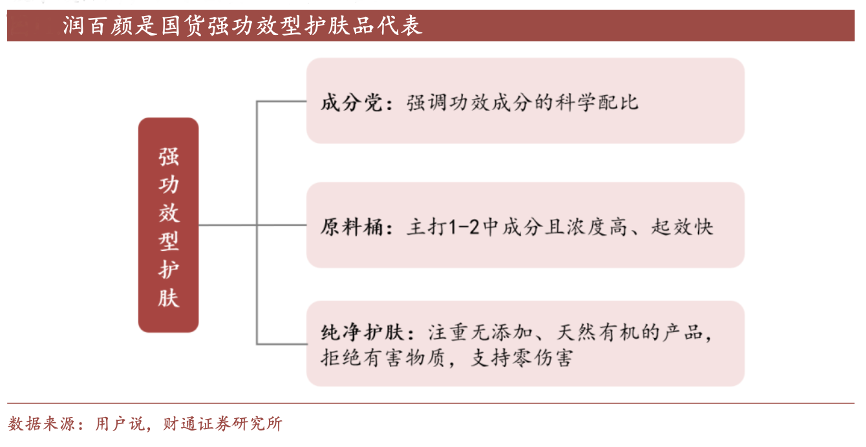 經(jīng)典案例:根據(jù)用戶(hù)說(shuō)、財(cái)通證券研究所等綜合資訊表明,主打單一成分的強(qiáng)功效護(hù)膚產(chǎn)品市場(chǎng)規(guī)模預(yù)計(jì)從2019 年的 120 億元提升至 2024 年的 362 億 元。在玻尿酸高熱度的背景下,潤(rùn)百顏以“玻尿酸”為核心,搭配二裂酵母等網(wǎng)紅產(chǎn) 品構(gòu)建強(qiáng)功效護(hù)膚產(chǎn)品,以“玻尿酸大廠”研發(fā)實(shí)力背書(shū),迅速占領(lǐng)消費(fèi)者心智。