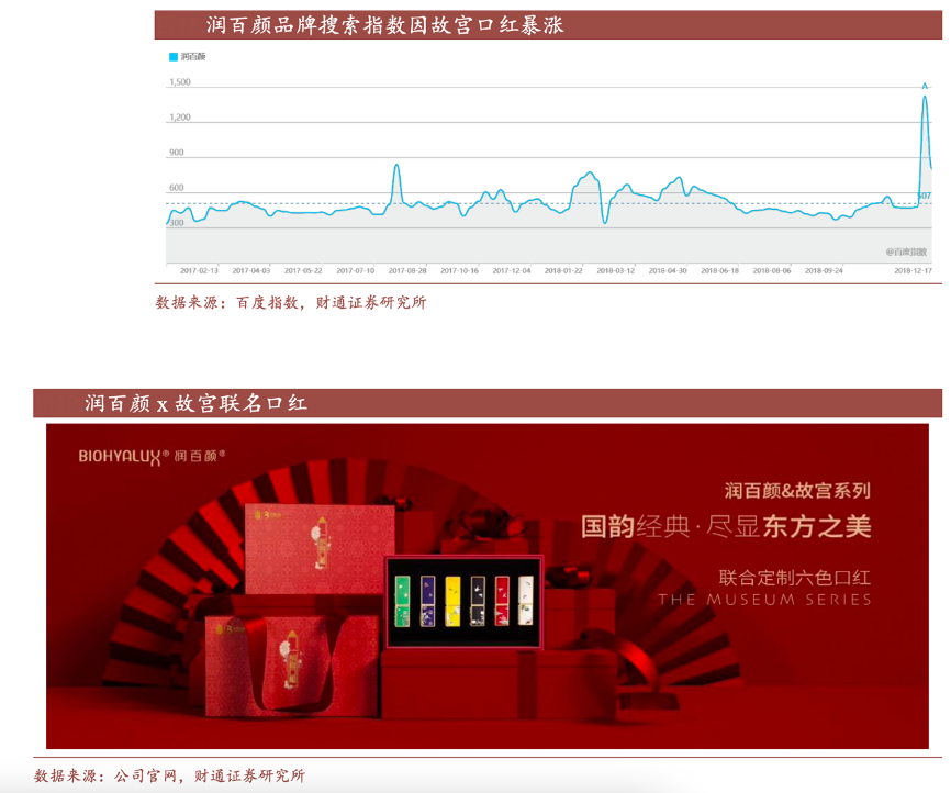 經(jīng)典案例:根據(jù)百度指數(shù)、公司官網(wǎng)、財(cái)通證券研究所等綜合資訊表明,2018 年 12 月 9 日潤(rùn)百顏聯(lián)合故宮博物院發(fā)布新品故宮口紅,僅一天預(yù)定數(shù)已經(jīng)超 過(guò)一千支,其中最火的“朗窯紅”色號(hào)目前預(yù)定數(shù)已超過(guò)600支。“故宮口紅”的爆火,對(duì)潤(rùn)百顏品牌影響力即刻產(chǎn)生了積極反饋,第二天潤(rùn)百顏品牌搜索 指數(shù)飆升至 1422,創(chuàng)造了品牌自成立到當(dāng)時(shí)的最高熱度。