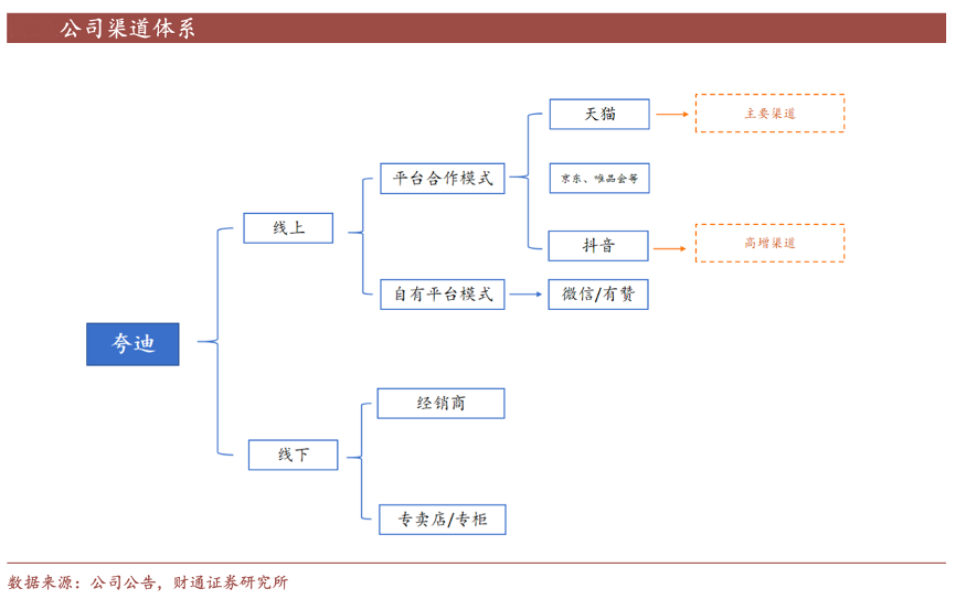 經(jīng)典案例:根據(jù)公司公告、財通證券研究所等綜合資訊表明,華熙生物公司線上渠道覆蓋天貓/京東/唯品會等主流電商和抖音短視頻電商,合作模式為平 臺合作模式,合作方式為在平臺開設旗艦店、專賣店進行直銷。其線下渠道方面,目前開設 3 家潤百顏實體店,200家夸迪加盟店。