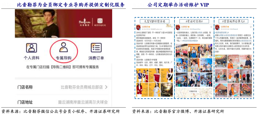 經典案例:根據比音勒芬微信公眾號會員小程序、比音勒芬官方微博、開源證券研究所等綜合資訊表明,比音勒芬為會員綁定專業導購并提供定制化服務,在消費后店員會記錄該顧客的衣服尺碼及偏好,并定期根據顧客需求通過微信定向更新新款產品信息。顧客可以選擇到店或者在家試穿,門店可直接將新品快遞到家完成遠程交易。同時,公司十分關注 VIP 的需求并定期維護,如定期邀請 VIP 進店、生日回訪、贈送禮品或邀請 VIP 成為首批新品體驗官等,增加 VIP 品牌粘性。