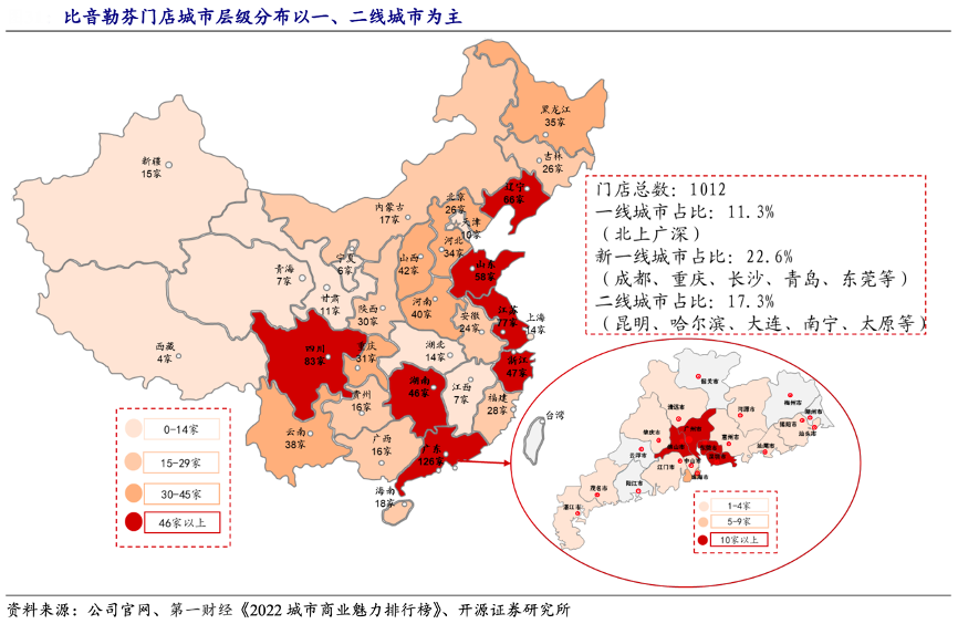 經典案例:根據公司官網、第一財經《2022城市商業魅力排行榜》、開源證券研究所等綜合資訊表明,結合官網的門店數據,目前一線(北上 廣深)、新一線、二線城市的門店數量占比分別為 11.3%/23.1%/17.3%,門店主要位于高端商場、高鐵機場、奧特萊斯等。而三線以下城市門店占比為48.3%。