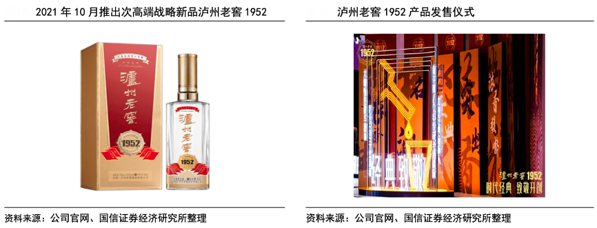 經典案例:根據公司官網、國信證券經濟研究所等綜合資訊表明,2021年10 月瀘州老窖公司推出次高端戰略新品瀘州老窖 1952(52 度 500ml),建議零售價 899 元,一方面意在補充布局 600-800 元價格帶,完善產品矩陣,與低度老窖共同加碼次高端市場;另一方面也是瀘州老窖品牌復興的重要一環,希望借此產品拉升瀘州老窖品牌的形象。新品名稱寓意致敬 1952 年瀘州老窖在全國第一屆評酒會上奪得“四大名酒”稱號,被譽為濃香酒的典型代表、酒中泰斗。