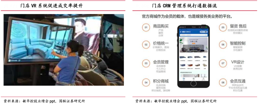 經(jīng)典案例:根據(jù)敏華控股業(yè)績會PPT、國聯(lián)證券研究所等綜合資訊表明,敏華控股進(jìn)行經(jīng)銷商賦能 1031 工程,主要關(guān)注“客流*轉(zhuǎn)化率*客單價=銷售額”四個關(guān)鍵指標(biāo)的改善。客流方面,公司總部的營銷活動如廣告、代言人宣傳、直播等活動,提高品牌知名度擴(kuò)大客流;轉(zhuǎn)化率方面公司的 VR 系統(tǒng)和 CRM 系統(tǒng)打通消費(fèi)者的設(shè)計布局呈現(xiàn)和客戶到經(jīng)銷商到總部的信息流,提高客戶轉(zhuǎn)化率;而要客單價方面,公司拓展的多品類業(yè)務(wù)如配套產(chǎn)品、床墊、全屋定制,使得沙發(fā)業(yè)務(wù)和其它業(yè)務(wù)協(xié)同提升客單價。
