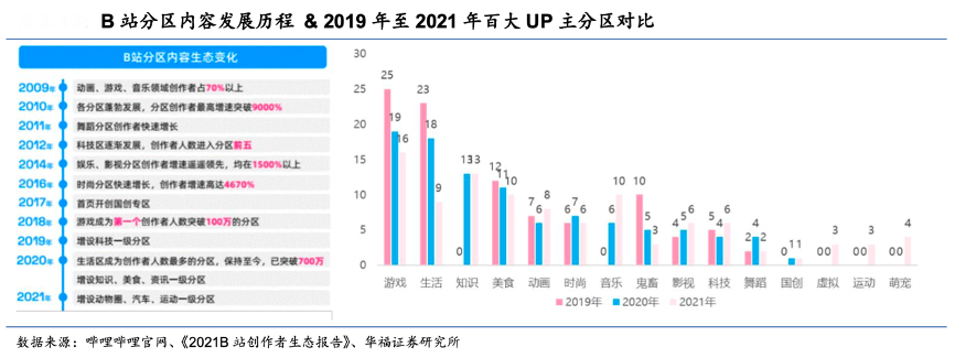 經典案例:根據嗶哩嗶哩官網、《2021 B站創作者生態報告》、華福證券研究所等綜合資訊表明,2019 年是 B 站破圈元年,包括舉辦2019 年跨年晚會《bilibili 晚會:2019 最美的夜》、購買《英雄聯盟》全球總決賽 S10 至S12(2020 年至 2022 年)的中國獨家直播權、邀請明星、學術大咖和社會機構 進駐等破圈動作都卓有成效,促進了社區本身內容品類的多元化。對比 2021 年與 2019 年的 B 站百大 UP 主,UP 主們的背景更加多元化,所在的分區數量從 9 個增加到 15 個,新增了虛擬、萌寵、運動、音樂、國創和知識 6 個板塊。