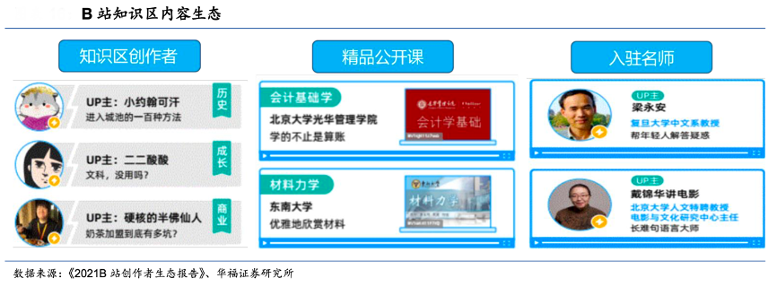 經典案例:根據《2021 B站創作者生態報告》、華福證券研究所等綜合資訊表明,目前 B 站知識區已經發展成為 B 站流量最大的分區,2021 年, 泛知識內容在 B 站總播放量占比達到了 45%,超過 300 位名師學者(包括中國科學 院院士汪品先、屢次出圈的法學教授羅翔等)入駐 B 站,有 1.9 億用戶在 B 站觀看泛知識類視頻,相當于中國在校大學生數量的 5 倍。