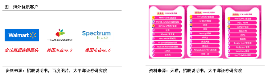 經(jīng)典案例:根據(jù)天貓、百度圖片、招股說明書、太平洋證券研究院等綜合資訊表明,乖寶公司前五大客戶包含沃爾瑪、SMUCKER、 Spectrum Brands,客戶資源優(yōu)質(zhì)。其合作平臺(tái)包含 天貓/京東/抖音等,自主品牌“麥富迪”天貓雙11品牌銷量第一,狗主糧/零食品類第一,充分受益線上紅利。