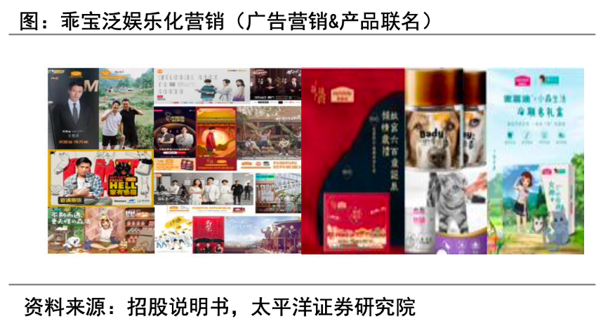 經(jīng)典案例:根據(jù)招股說明書、太平洋證券研究院等綜合資訊表明,乖寶公司積極投入營(yíng)銷,采取泛娛樂化策略:明星代言、合作電視/游戲等文娛節(jié)目,孵化線上新媒體平臺(tái)社區(qū)達(dá)人 (KOL),打造泛娛樂化聯(lián)名產(chǎn)品,定位年輕消費(fèi)群體,營(yíng)造“有貓有狗就 有麥富迪”的品牌理念。