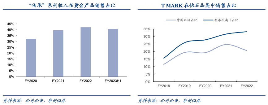 經典案例:根據公司公告、華創證券等綜合資訊表明,周大福注重產品創新,傳承及人生四美等系列產品頻出,繁復工藝與精巧設計彰顯品牌匠心,一方面產品差異化優勢凸顯,另一方面新品亦成為主力產品,傳承系列在黃金產品收入中占比已超四成。
