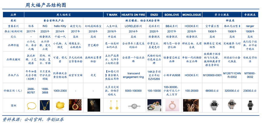 經(jīng)典案例:根據(jù)公司官網(wǎng)、華創(chuàng)證券等綜合資訊表明,周大福在黃金首飾及產(chǎn)品FY2018-2022年復(fù)合增長率6.6%,珠寶鑲嵌類則因黃金首飾產(chǎn)品與鐘表類占比上升,占比有所下降,占比約21.7%,其中 T MARK 因獨(dú)特定制模式收入持續(xù)提升。