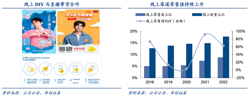 2020 年初,公司推出“云商 365”微信小程序, 將客戶引流到公司網(wǎng)絡(luò)旗艦店,通過小程序連接顧客與員工,顧客透過手機(jī)享受一站式服務(wù)。隨著 2020 年“云商 365”與“云柜臺”的推出,F(xiàn)Y2021/FY2022 線上零售值占比相對大幅增大,分別為 7.1%/8.6%,同 增 2.1%/1.5%。