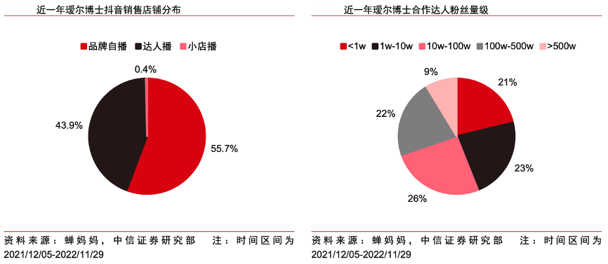 經典案例:根據蟬媽媽、中信證券研究部等綜合資訊表明,結合蟬媽媽數據,在近一年時間內,璦爾博士品牌自播貢獻了55.7%的銷售額,達人播占 43.9%。在達人播中,璦爾博士更多與中腰部主播合作,1w~100w 達人占總合作達人數的49%,超過 500w 的合作達人數僅占9%。