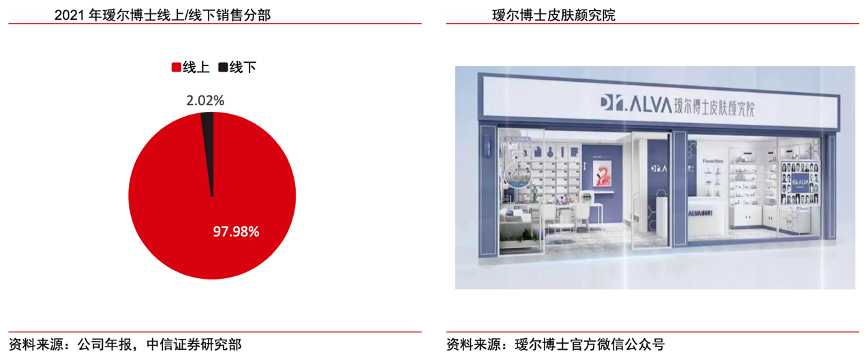 經典案例:根據公司年報、璦爾博士官方微信公眾號、中信證券研究部等綜合資訊表明,璦爾博士采取線上線下全面布局、多渠道共同發展的思路。線上以天貓、抖音為主,其中天貓為品牌主陣地,抖音起量迅速;線下以單品牌店+商圈店布局全國,著力打造璦爾博士皮膚顏究院,構建新零售體系。截至 2021 年底,璦爾博士皮膚顏究院加盟商已覆蓋全國 40+城市;2021 年,璦爾博士實現營業收入 7.44 億元,其中線上貢獻 97.98%。