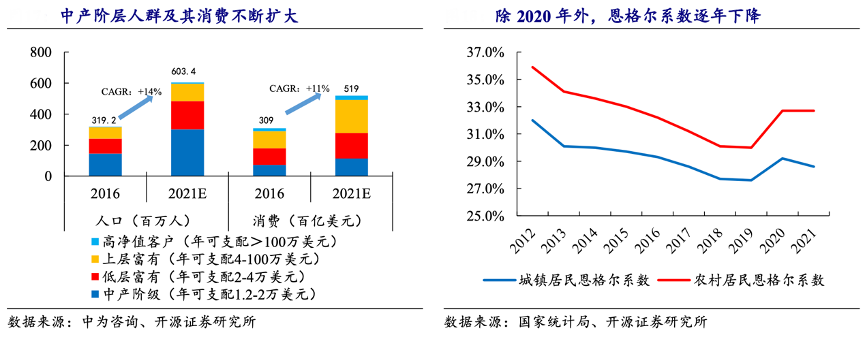 經典案例:根據中為咨詢、國家統計局、開源證券研究所等綜合資訊表明,中產階層人群擴大利好中高端 服飾行業增長。截至2021年,除 2020 年外,城鎮和農村的恩格爾系數均逐年下降。中產階級的人口和消費增速可觀,2021 年分別達 6.03 億人次及 5.19 萬億美元, 2016-2021 年復合增速分別為 14%及 11%。