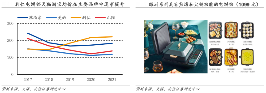經典案例:根據久謙、天貓、安信證券研究中心等綜合資訊表明,利仁公司電餅鐺產品不斷推陳出新,通過增加鍋類配件和改變產品形態,產品實現了煎烤涮煮等多種烹飪方式。多功能電餅鐺的菜譜不再僅限于煎餅,擴展了產品潛在用戶群,對獨居空間較小的年輕群體具有較大吸引力。根據久謙數據,利仁電餅鐺產品 2021 天貓均價較 2017 年提升 48.3%,為主要品牌中均價唯一提升的品牌。