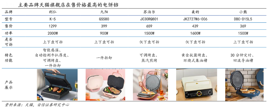 經典案例:根據天貓、安信證券研究中心等綜合資訊表明,利仁公司產品在高端市場具有領先地位,和其他品牌的電餅鐺形成差異化競爭。K-5 為公司線上在售煎烤機最貴的型號,除了產品功能及智能化程 度較高外,該產品的價格遠高于其它主要品牌的最貴型號。利仁通過差異化的高端產品,打 開了行業煎烤機的價格天花板,和其它品牌展開錯位競爭。