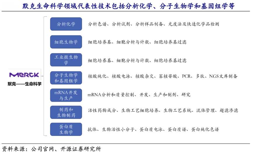 經典案例:根據公司官網、開源證券研究所等綜合資訊表明,默克是行業領先的科技公司,專注于生命科學、醫藥健康、電子科技三大業務。具體到生命科學而言,默克旗下的默克密理博是生命科學行業三大供應商之一,由生命科學部、實驗室方案部和過程方案部三個部門組成,主要為生命科學行業提供 創新性工具和解決方案,提供制藥、臨床診斷、蛋白質研究、細胞生物學及實驗室 所需要的各類儀器耗材產品。