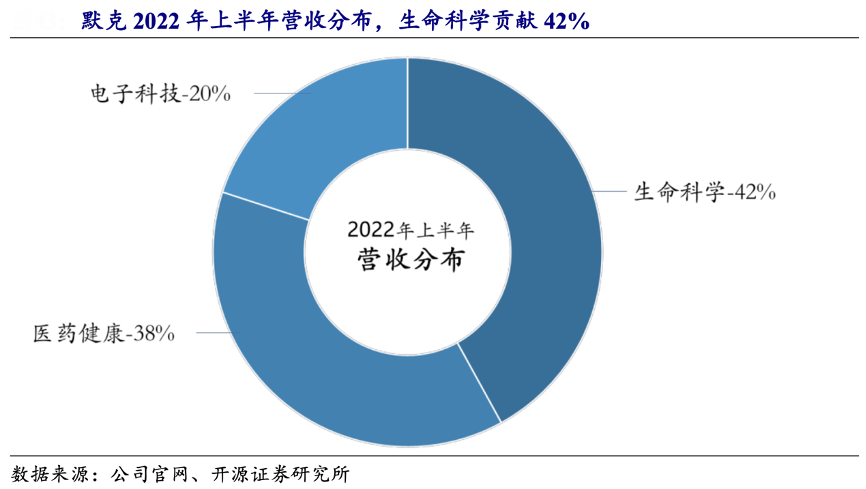 經典案例:根據公司官網、開源證券研究所等綜合資訊表明,默克 2022 年半年報數據顯示,生命科學、醫藥健康、電子科技業務對于營業收入的貢獻分別為 42%、38%和 20%。