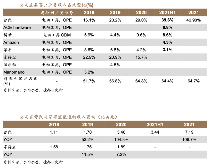 經典案例:根據公司公告、德邦研究所等綜合資訊表明,泉峰公司與勞氏深度綁定,截至 21H1,公司前五大客戶收入占比為 64.4%,分 別為勞氏(39.6%)、ACE hardware(8.8%)、Bosch(8.6%)、亞馬遜(4.3%)、 翠豐(3.1%),其中公司主要為 Bosch 提供電動工具的 ODM 業務。2021年作為與勞氏建立戰略合作伙伴關系后的第一個完整運營年,公司在勞氏渠道的收入達到 7.2 億美元,占比為 40.9%。
