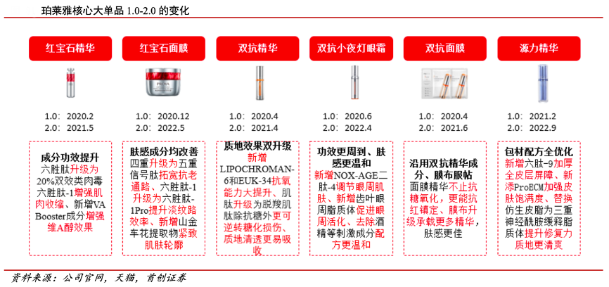 經(jīng)典案例:根據(jù)公司官網(wǎng)、天貓、首創(chuàng)證券等綜合資訊表明,在大的單品成功塑造后,珀萊雅不斷更新迭代新的產(chǎn)品,2.0 版本的紅寶石精華升級六勝肽成分,增強了 A 醇效果;雙抗精華在原有基礎(chǔ)上提升抗氧能力,同時使得成分更易被吸收;源力精華則新增六肽-9 加強全皮層屏障,同時優(yōu)化配方,在功效上提升修復(fù)力,在使用感上增加清爽度。