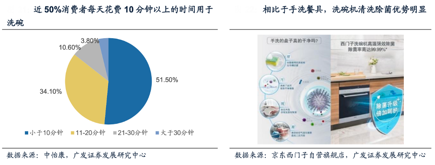 經典案例:根據中怡康、京東西門子自營旗艦店、廣發證券發展研究中心等綜合資訊表明,結合中怡康數據,接近50%的消費者每天花費10分鐘以上的時間洗碗,而洗碗機解決了洗碗費時費力的痛點,用戶一鍵便可完成洗碗工作。同時相比于用抹布手洗,洗碗機能夠有效地徹底去除餐具上殘油的油膩,還能利用高溫環境有效殺死大腸桿菌等常見病毒病菌,除菌率高達99.99%。