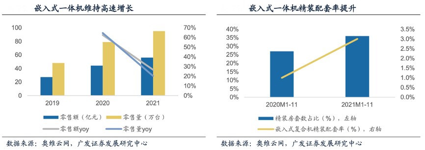 經典案例:根據奧維云網、廣發證券發展研究中心等綜合資訊表明,蒸烤一體機市場快速發展,精裝房配套率提升。以嵌入式蒸烤一體機為例,市場規 模保持高速增長。奧維云網數據顯示,零售渠道,嵌入式蒸烤一體機近兩年銷額、銷量復合增速分別達到43.5%、40.7%,2021全年銷售額達到56億元,同比增長26.7%; 銷量達到95萬臺,同比增長20.3%。