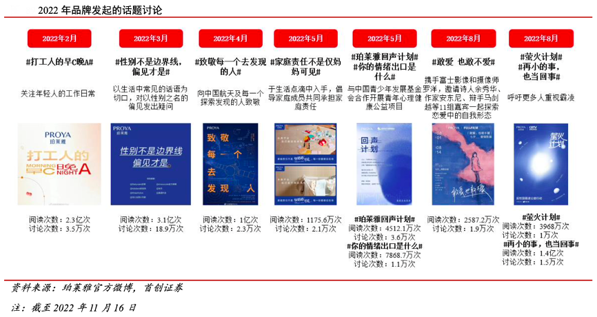 經(jīng)典案例:根據(jù)珀萊雅官方微博、首創(chuàng)證券等綜合資訊表明,珀萊雅公司以生活中的高關(guān)注度話題為中心進(jìn)行引流。2021年《性別不是邊界線 偏見才是》和《致愛里的勇敢者》分別榮獲 2021 年金獅獎(jiǎng)-美妝護(hù)膚類最佳文案和金獅獎(jiǎng) -美妝護(hù)膚類最佳廣告影片。2022 年因大部分對(duì)標(biāo)人群為上班族,珀萊雅將打工人和“早 C 晚 A”聯(lián)系在一起,用功效性的產(chǎn)品對(duì)抗加班熬夜的生活。具有價(jià)值的話題會(huì)被多年多次提出,2022 年 3 月,珀萊雅再次聚焦性別話題,截至 2022 年 11 月 16 日, #性別不是邊界線 偏見才是#話題的閱讀次數(shù)已達(dá)到 3.1 億次。