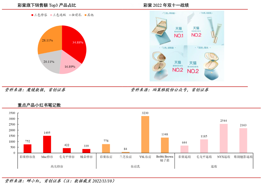 經(jīng)典案例:根據(jù)魔鏡數(shù)據(jù)、珀萊雅股份公眾號(hào)、蟬小紅、首創(chuàng)證券等綜合資訊表明,珀萊雅大單品銷售亮眼,根據(jù) 22 年 1-10 月線上銷售數(shù)據(jù),彩棠主打的三款大單品三色修容、三色遮瑕及妝前乳分別占據(jù)品牌總銷額的34.88%、16.89%、20.11%。小紅書的推薦中,三款產(chǎn)品毫不遜色,出現(xiàn)在各達(dá)人與修容產(chǎn)品相關(guān)的測評(píng)中。2022 年,在競爭激烈的雙十一戰(zhàn)場上,彩棠的產(chǎn)品分別占據(jù)天貓高光類目的前兩名以及遮瑕妝前類目的第二名的位置。