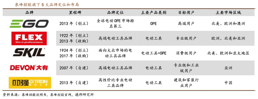 經典案例:根據泉峰招股說明書、泉峰控股官網、德邦研究所等綜合資訊表明,泉峰公司已經建立了多樣化的品牌組合,不同品牌覆蓋不同的市場區域以及定位具有差異,能夠滿足世界各地終端用戶的多樣化需求。其中OPE 產品品牌 EGO 市場規模復合增速最快,由 18 年的 1.75 億美元提升至 20 年的 4.59 億元,占公司收入比重由25.3%迅速提升至 21H1 的 39.3%。