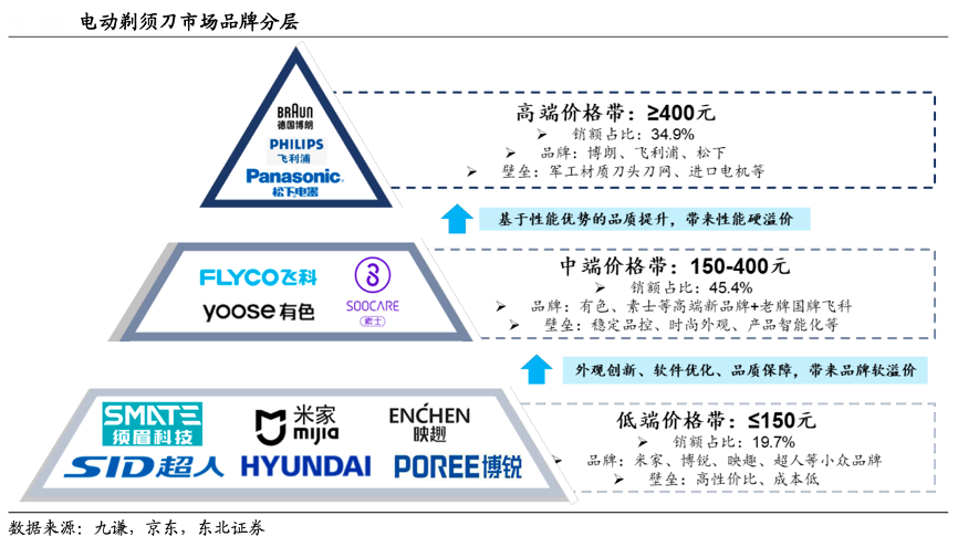 經典案例:根據九謙、京東、東北證券等綜合資訊表明,我國電動剃須刀市場以飛科和飛利浦構成兩強格局,近年來眾多新品牌加入競爭,形成高端(>400 元,占比 34.9%)、 中端(150-400 元,占比 45.4%)、低端(<150 元,占比 19.7%)的分層。其中高端以飛利浦、博朗等外資品牌為主,其基于先發優勢在刀頭刀網、電機等零部件的材質和工藝上擁有高品質優勢。