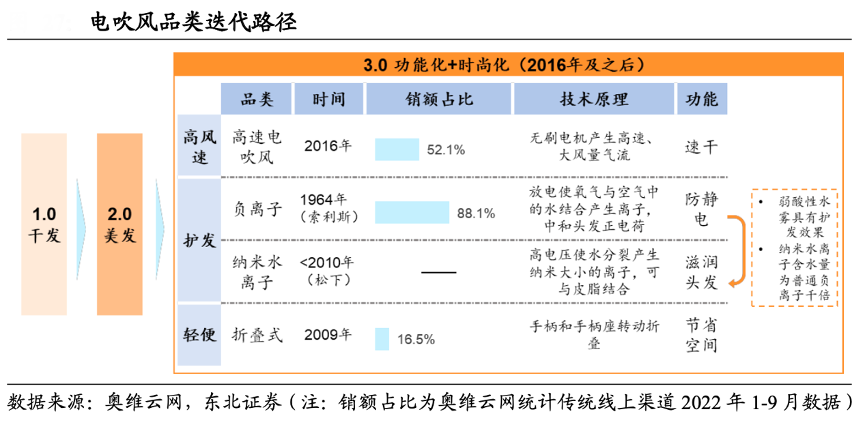 經典案例:根據奧維云網、東北證券等綜合資訊表明,2015年之前電吹風為僅具備單一干發功能的產品,2016年起電吹風圍繞高風速、護發、便攜三大方向開始新一輪迭代升級,并演化出高速電吹風、負離子/水離子電吹風、折疊式電吹風等不同品類,其中主打護發功能的負離子電吹風已具備較高銷額占比、而高速電吹風尚處發展前期。