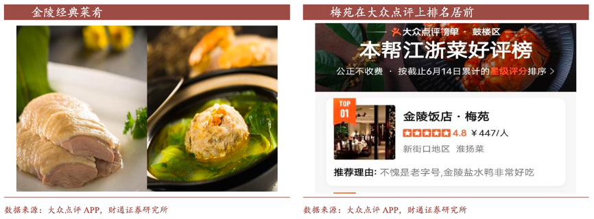 經典案例:根據大眾點評APP、財通證券研究所等綜合資訊表明,金陵飯店 共有七家餐廳,分別為璇宮餐廳、香江餐廳、太平洋餐廳、金海灣餐廳、梅苑餐 廳、櫻花苑餐廳以及金淼餐廳,其中,以梅苑餐廳最為著名。梅苑餐廳以正統淮 揚菜為基礎,經過其他菜系廚師的調整,形成了現代金陵菜。今天梅苑已是公認的淮揚菜殿堂之一,經典菜如金陵鹽水鴨、蟹粉獅子頭等受到當地居民及游客的認同。