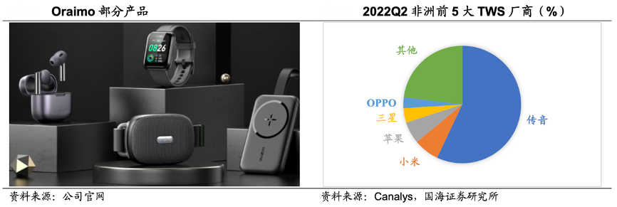 經(jīng)典案例:根據(jù)公司官網(wǎng)、Canalys、國(guó)海證券研究所等綜合資訊表明,傳音公司 3C 匹配件品牌 oraimo,定位為新興市場(chǎng)高端知名音頻品牌。產(chǎn)品類型涵 蓋 TWS 和 Open audio、音箱和有線耳機(jī)四個(gè)大品類,其中 TWS 方向?yàn)槠放浦?nbsp;攻。品牌專注于為全球年輕消費(fèi)者打造酷炫的、獨(dú)具創(chuàng)意的智能配件產(chǎn)品,現(xiàn)已成為非洲最受消費(fèi)者歡迎的 3C 配件品牌之一,截至 2022 年 9 月,已成功覆蓋 非洲、南亞,東南亞,拉美等 50 多個(gè)國(guó)家和地區(qū),用戶規(guī)模超 1 億。