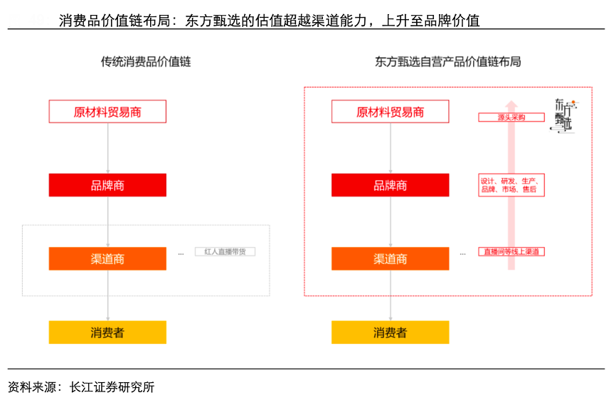 經(jīng)典案例:根據(jù)長江證券研究所等綜合資訊表明,東方甄選的獨特稟賦在于,公司作為具備國民級認(rèn)知的教育品牌,有潛力從渠道向上,挖掘自營品牌心智、把控生產(chǎn)供應(yīng)鏈,將核心的定價權(quán)掌握在自己手上,并盡可能參與價值鏈上更多利潤環(huán)節(jié)。