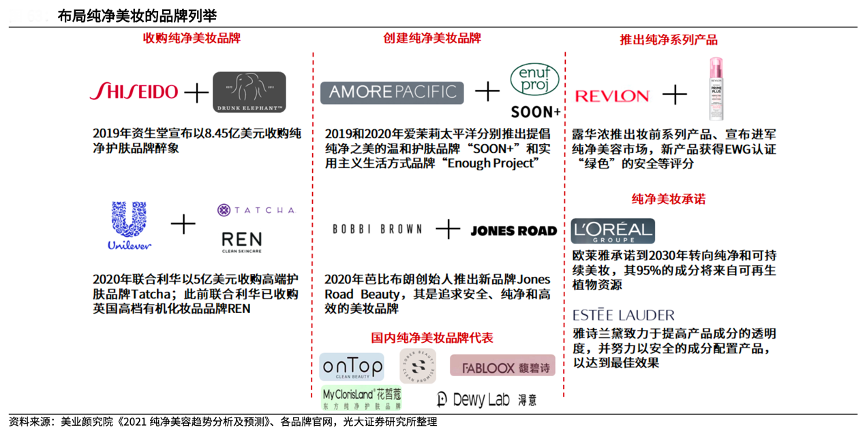 經典案例:根據美業顏究院《2021純凈美容趨勢分析及預測》、各品牌官網、光大證券研究所等綜合資訊表明,隨著純凈美妝概念興起,品牌商紛紛入局純凈美妝賽道,國外化妝品品牌亦通過收購或自建品牌入局純凈美妝賽道,例如,資生堂 2019 年以 8.45 億美元收購新銳純凈護膚品牌醉象,聯合利華 2020 年以 5 億美元收購天然的高端護膚品牌 Tatcha,且早在五年前聯合利華已收購高檔有機化妝品品牌 REN。