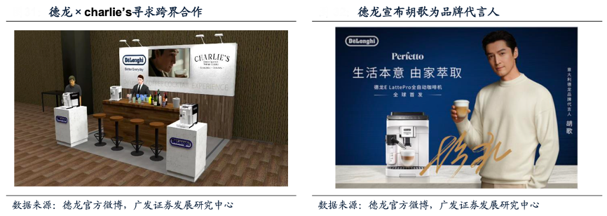 經典案例:根據德龍官方微博、廣發證券發展研究中心等綜合資訊表明,2021年,德龍簽約胡歌為品牌代言人,提升品牌知名度,同時基于“跨界營銷”理念,不斷尋求出圈機會,包括2021年7月德龍與廟前咖啡charlie’s 共同呈現咖啡與雞尾酒的跨界活動,以及2022年9月攜手上海東一美術館合作舉辦藝術展等。