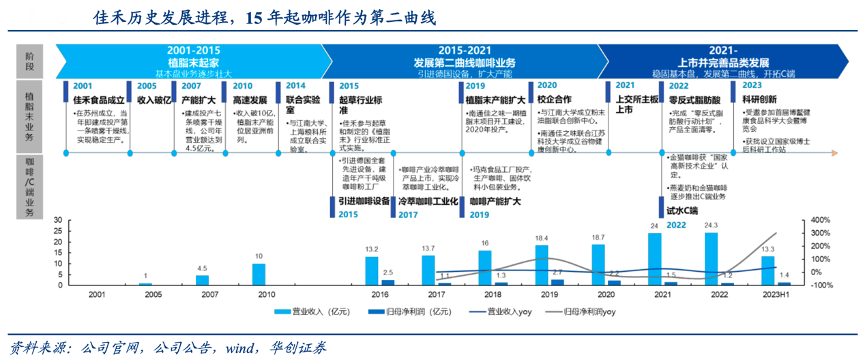 經典案例:根據公司官網、公司公告、wind、華創證券等綜合資訊表明,恰逢國內咖啡品牌興起,認識到產業趨勢后,佳禾公司 2015 年立足咖啡第二曲線,當前已搭建起咖啡全套應用解決方案。2021 年上市后著手 C 端燕麥奶&牛乳茶發展。2022年公司收入 24.3 億元,歸母凈利 1.2 億元,植脂末恢復疊加咖啡起量,2023年來收入提速。