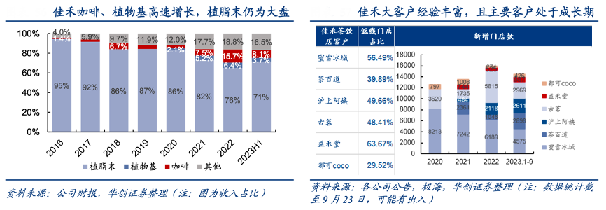 經典案例:根據公司財報、各公司公告、極海、華創證券等綜合資訊表明,植脂末性價比高且口感好,廣泛應用于咖啡和奶茶,行業整體成熟,但佳禾份額僅占 14%,投產后預計達 20%,行業其他均為中小企業,佳禾定制化服務能力強,主要客戶處于成長期,是基本盤業務。