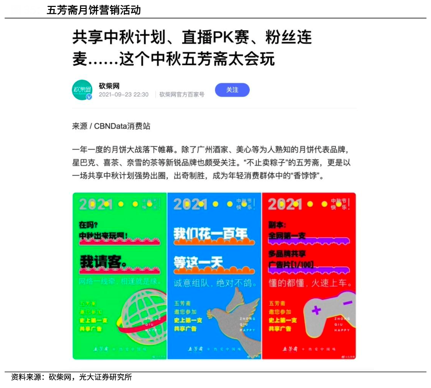 經典案例:根據砍柴網、光大證券研究所等綜合資訊表明,五芳齋以用戶思維進行營銷,對渠道、類型進行分類圈層種草。五芳齋結合多種年輕化 玩法,保持品牌活力,通過產品的品質感、話題性吸引追求新鮮感的年輕消費群體。2021 年的中秋營銷活動中,五芳齋更是聯合多家品牌,開啟了五芳齋共享中秋計劃,在視頻中與多家品牌進行合作,打造了行業首支共享廣告視頻,獲得了線上線下諸多消費者的熱議與好評。