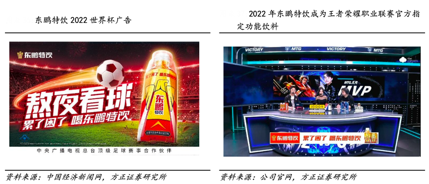 經(jīng)典案例:根據(jù)公司官網(wǎng)、中國經(jīng)濟(jì)新聞網(wǎng)、方正證券研究所等綜合資訊表明, 2018 年俄羅斯世界杯和 2022 年卡塔爾世界杯期間,公司兩度榮任央視總臺(tái)頂級足球賽事合作伙伴,能量飲料天然契合體育賽事,高效能投放快速擴(kuò)大東鵬特飲品牌力,持續(xù)放大品牌聲量。此外,2022 年東鵬特飲成為王者榮耀職業(yè)聯(lián)賽官方指定功能飲料,在 217 個(gè)比賽日里以多方位的廣告形式將品牌植入賽事,著重深耕電競?cè)巳骸?