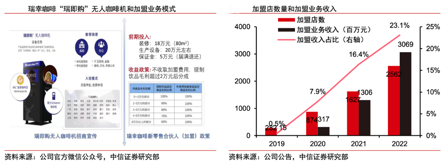 經(jīng)典案例:根據(jù)公司官方微信公眾號、公司公告、中信證券研究部等綜合資訊表明,依托公司強(qiáng)大的中臺,瑞幸采用輕資產(chǎn)模式+新零售業(yè)務(wù)多線擴(kuò)張,優(yōu)化投入變現(xiàn)。公司通過加盟(聯(lián)營)這一相對輕資產(chǎn)的業(yè)務(wù)模式降低品牌擴(kuò)張的資金壓力,同時(shí)提高供應(yīng)鏈整體的產(chǎn)能利用率,優(yōu)化品牌端和供應(yīng)鏈端的投資收益水平。至 2022 年底,瑞幸咖啡加盟店共 2,562 家,占總門店數(shù)的 31%; FY2022 加盟貢獻(xiàn)收入 30.7 億元,占總收入的 23.1%。
