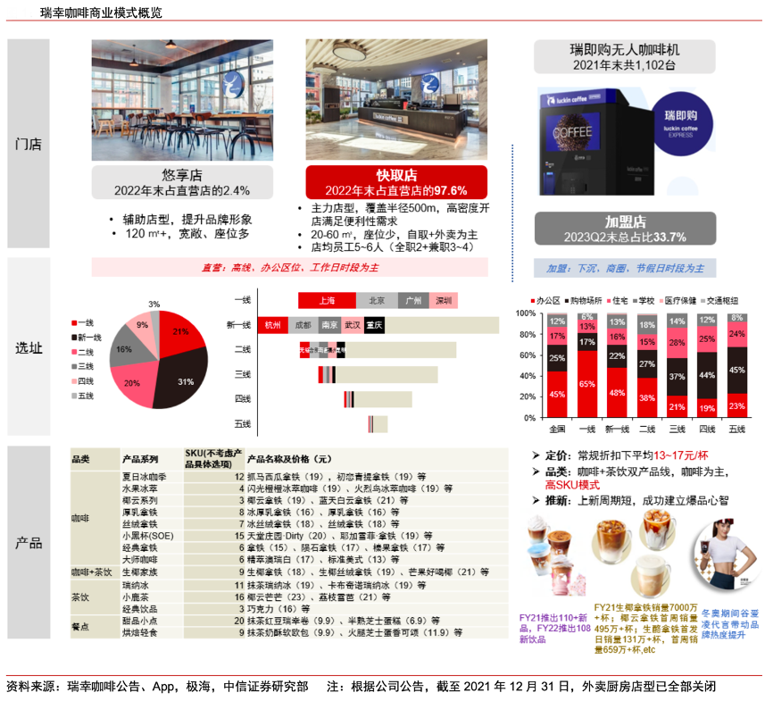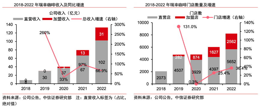 經典案例:根據公司公告、中信證券研究部等綜合資訊表明,瑞幸咖啡公司 2022 年收入達到 133 億元、同比+66.9%,2018-22 年 CAGR 達 99%,快速開店和同店高增共同驅動收入強勢增長。FY2022 收入構成上 77%來自直營門店、瑞即購等直營渠道銷售,23%來自加盟店。