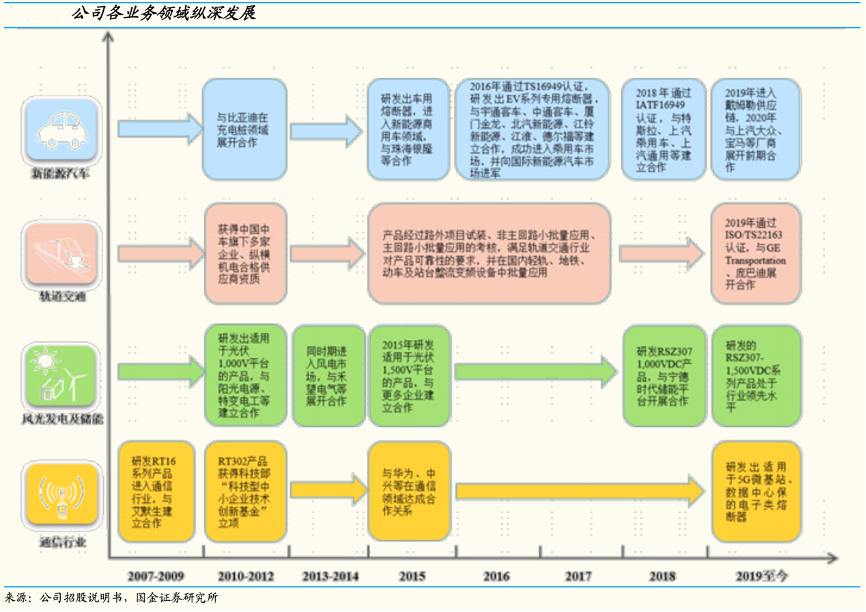 經典案例:根據公司招股說明書、國金證券研究所等綜合資訊表明,中熔電氣公司聚焦電力熔斷器中高端市場,不斷開拓新領域,陸續進入通信、新能源光伏、軌道交通、新能源汽車市場。