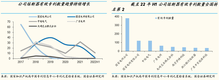 經典案例:根據國家知識產權局中國專利信息中心—專利之星檢索系統、國金證券研究所等綜合資訊表明,中熔電氣公司高度重視技術研發及自主創新,截至 2022 年 H1,公司及子公司共擁有 168 項國家專利,其中 3 項發明專利、165 項外觀 設計及實用新型專利。國家專利信息中心數據顯示,公司目前擁有熔 斷器相關的有效專利數量為 121 項、排名全國第 2,排名第一位的為 國家電網有限公司(曾用名:國家電網公司)。