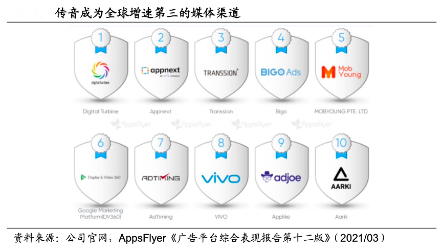 經(jīng)典案例:根據(jù)公司官網(wǎng)、AppsFlyers《廣告平臺(tái)綜合表現(xiàn)報(bào)告第十二版》(2021/03)、國(guó)海證券研究所等綜合資訊表明,傳音公司自主研發(fā) HIOS、itelOS、和 XOS 等智能終端操作系統(tǒng),同時(shí)與“互聯(lián)網(wǎng)大廠”合 作,在多個(gè)領(lǐng)域積極開發(fā)和孵化移動(dòng)互聯(lián)網(wǎng)產(chǎn)品,截至 2021 年 3 月,有多款自 主與合作開發(fā)的應(yīng)用產(chǎn)品月活用戶數(shù)超過1000 萬,根據(jù) Apps Flyer 發(fā)布的《廣 告平臺(tái)綜合表現(xiàn)報(bào)告第十二版》,傳音成為全球增速第三的媒體渠道,較上一版 報(bào)告上升一位,應(yīng)用安裝份額提升240%。