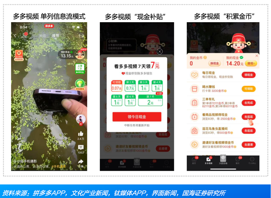經典案例:根據拼多多APP、文化產業新聞、鈦媒體APP、界面新聞、國海證券研究所等綜合資訊表明,拼多多的多多視頻用戶激勵:1)用戶每天新點擊觀看視頻,都可直接收到轉賬到微信的現金,VIP待遇只限每天觀看的前10個視頻左右,且每次的收益約為一分錢;2)完成任務積累金幣可進行單次體現,積累金幣任務不限于瀏覽、搜索和下單。