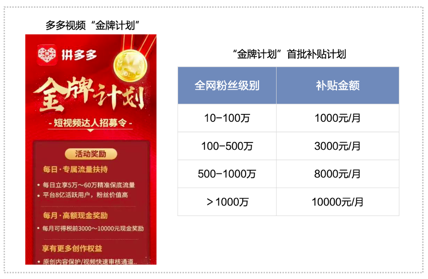 經典案例:根據拼多多APP、文化產業新聞、鈦媒體APP、界面新聞、國海證券研究所等綜合資訊表明,拼多多的“多多視頻達人激勵”在于:1)推出“金牌計劃”:首批計劃規定全網粉絲在10-100萬的達人,每月補貼1000元;粉絲在100-500萬的達人,每月補貼3000元;500-1000萬,每月補貼8000元;1000萬粉絲以上,每月補貼10000元;2)發起“百萬傭金助力計劃”:在綁定多多進寶的賬號中,選擇每周發布視頻并且成為“本周爆款”商品池中的 “獎“字商品,可以瓜分百萬傭金。