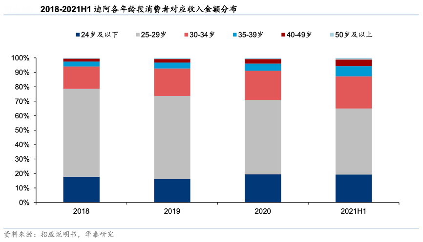 經典案例:根據招股說明書、華泰研究等綜合資訊表明,迪阿公司的主力消費者為 29 歲及以下的年輕消費群體,社媒、電商、短視頻等營銷方式也使得 DR 實現與年輕人同頻共振并獲得眾多年輕群體的消費青睞。同時,品牌力的泛化也讓越來越多的非婚慶消費群體選擇購買 DR 表達愛意。2021H1,34歲及以下消費者銷售額占公司銷售總額 87.2%,適婚人群仍為主力消費者;同時,35歲以上消費者占比逐步提升,印證了 DR 在非婚慶場景的品牌影響力。