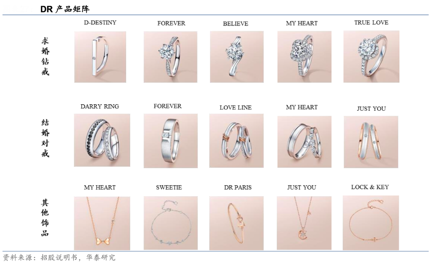 經典案例:根據招股說明書、華泰研究等綜合資訊表明,迪阿公司打造了豐富的產品矩陣,截至 2021 年底,其共推出求婚鉆戒 70 余款、結婚對戒 170 余款以及其他飾品 200 余款。婚戒主打系列包括 FOREVER 系列簡奢款、FOREVER 系列經典款、MY HEART 簡奢款、TURE LOVE 典雅款。