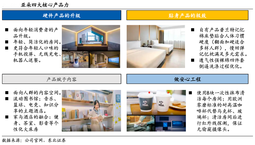 經典案例:根據公司官網、東北證券等綜合資訊表明,亞朵始終將高品質作為酒店競爭力的基礎,在產品硬件上基于年輕一代的需求進行升級,以“看得見”的優質貼身產品提升顧客睡眠體驗,通過可翻轉具有雙面硬度的普蘭特記憶棉床墊、支撐力較強的慢回彈記憶枕、透氣性強且高衛生標準的四件套等床品保障顧客的睡眠質量; 以個性化內容賦能產品,通過流通圖書館等具有內容的空間設計賦能產品,同時針對顧客需求推出健身大床房、冥想大床房等個性化產品。